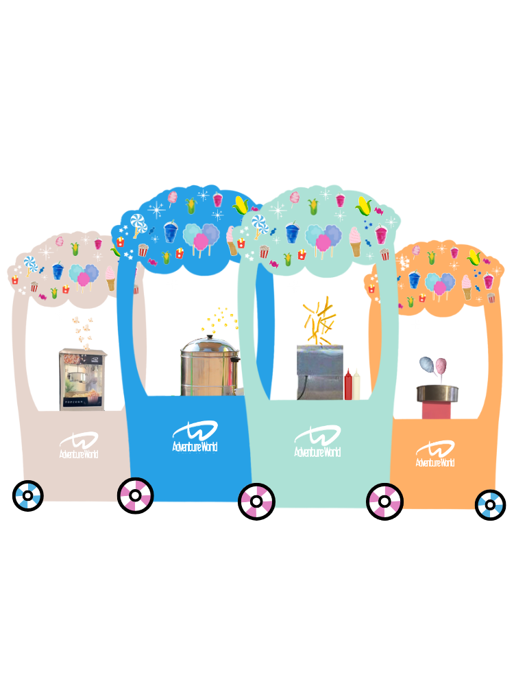 مميزة بألوانها الجميلة تدخل البهجة و السرور لك و لاطفالك, مكونة من عربات التسالي المتنوعة لاضافة المأكولات اللذيذة في جمعاتكم, و يمكن اضافة كمية اضافية حسب الرغبة بتكلفة اضافية. تاجير يومي ونجيك وين ماكنت.